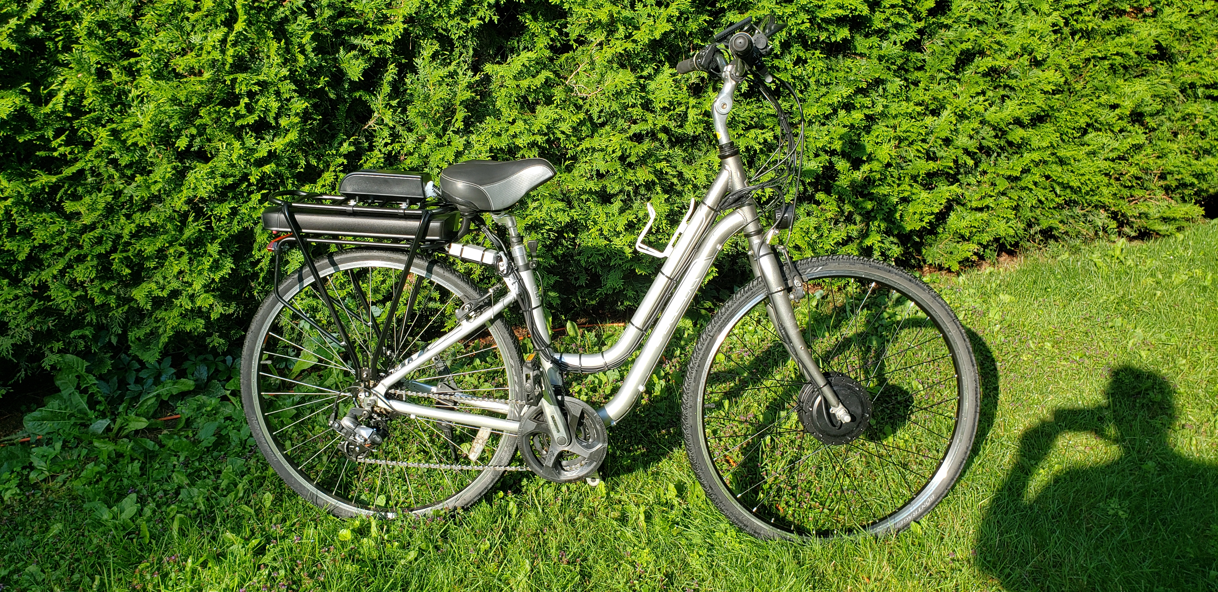 pour femme Minelli. Moteur roue avant de 500 watts, batterie sur porte-bagage